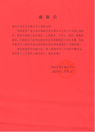 1月20日,襄陽中環(huán)水務(wù)有限公司云灣營業(yè)所收到來自高新區(qū)政務(wù)服務(wù)中心的感謝信,信中對云灣營業(yè)所2022年展現(xiàn)出的責(zé)任擔(dān)當(dāng),以及沖鋒在前、聞令而動的優(yōu)質(zhì)供水服務(wù)給予充分肯定與高度認(rèn)可。